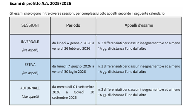 Gli esami si svolgono in tre diverse sessioni, per complessivi otto appelli, secondo il seguente calendario: